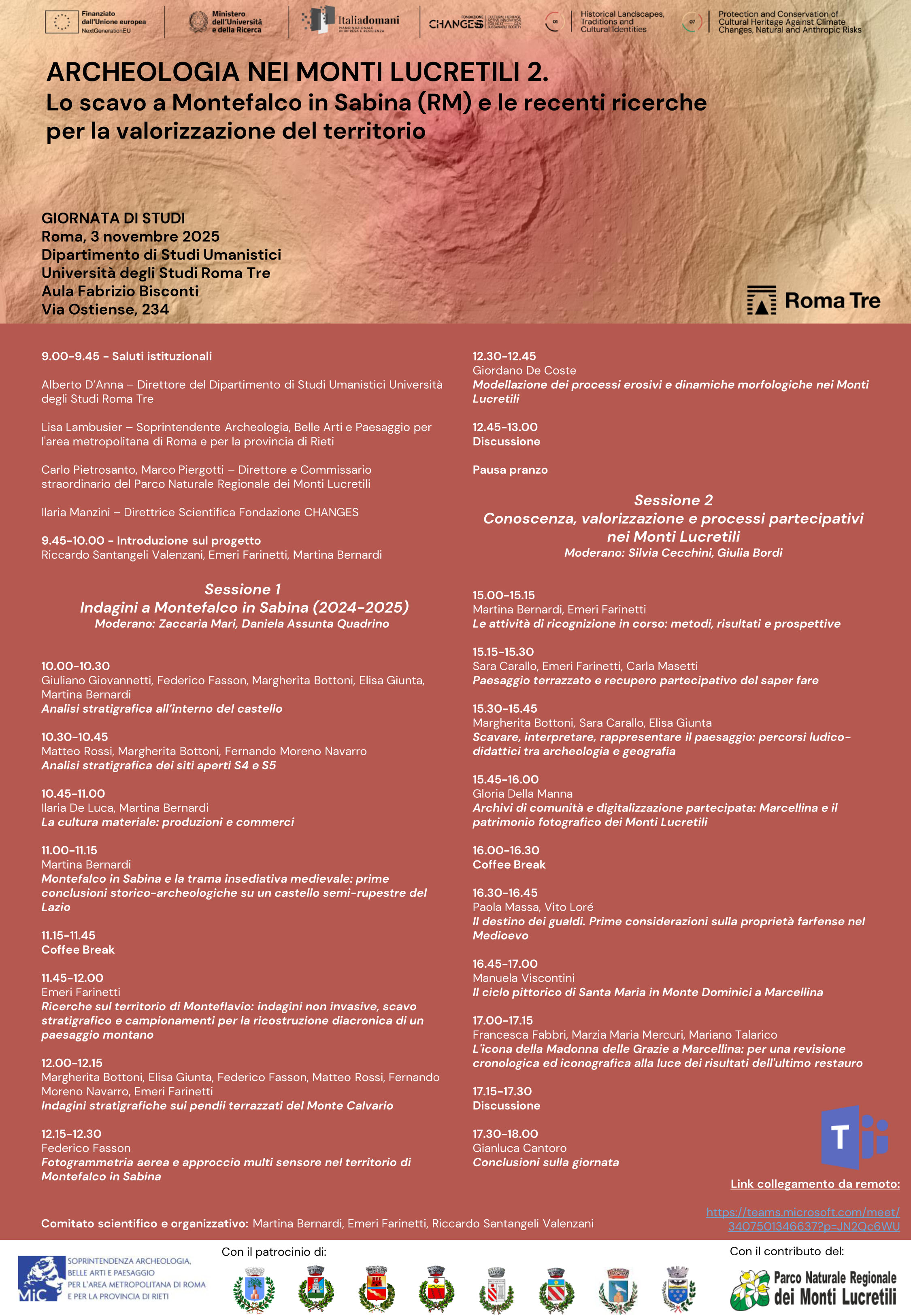 Il convegno presenterà i risultati delle recenti ricerche avviate nel territorio dei Monti Lucretili realizzate grazie al progetto CHANGES (Spoke 1 e 7).