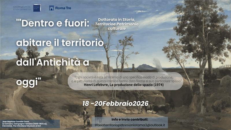 Il convegno internazionale del corso di Dottorato in "Storia, territorio, patrimonio culturale" dell'Università Roma Tre si propone come occasione di confronto interdisciplinare tra dottorand* e giovan* studios* che, nelle loro ricerche, pongano al centro il tema del territorio e delle sue interazioni con la società, in una prospettiva aperta al dialogo tra diverse discipline e approcci metodologici.