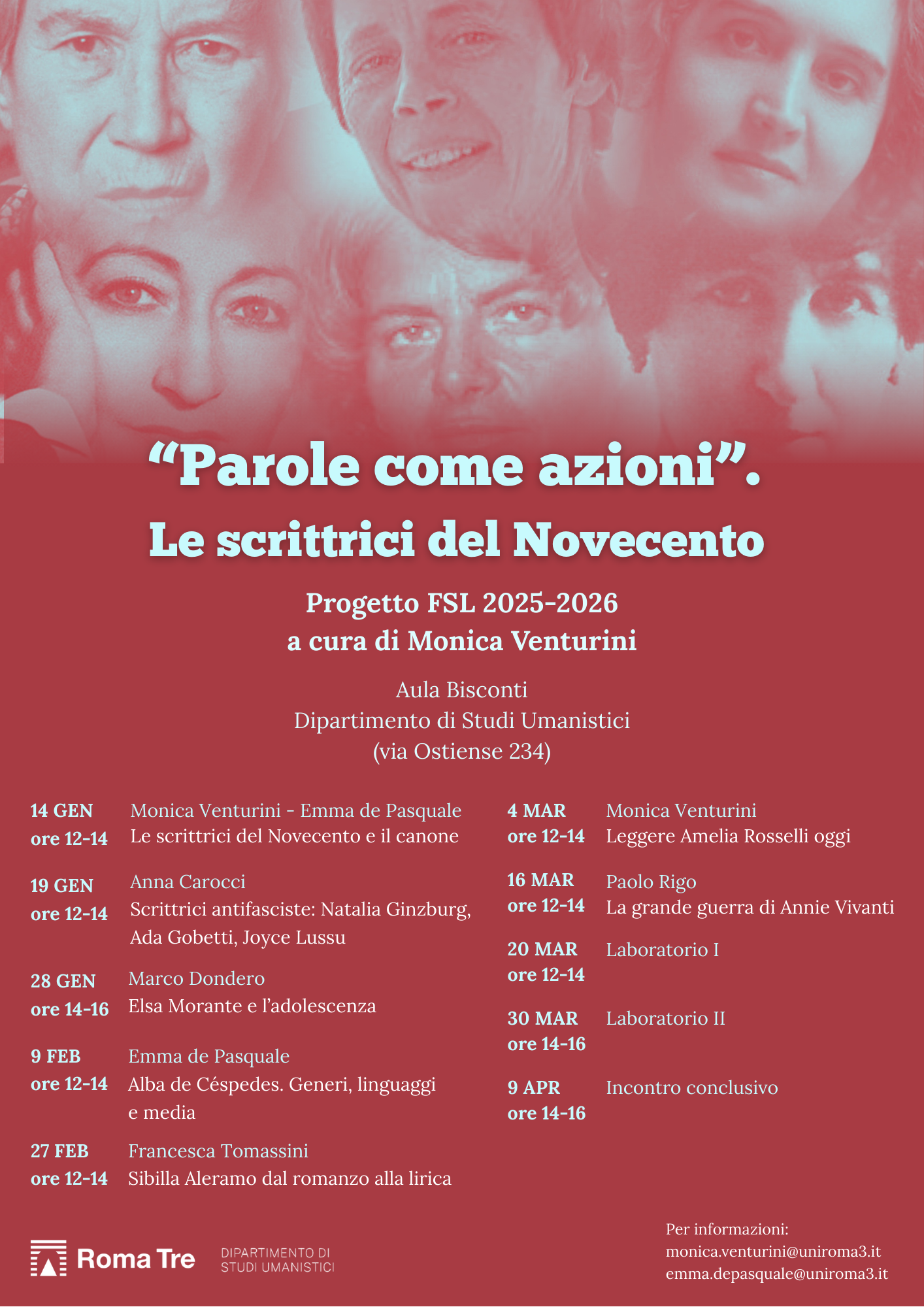 Dopo la partecipata edizione del 2024-2025, per il nuovo anno accademico si propone la seconda edizione del percorso di Formazione Scuola - Lavoro "'Parole come azioni'. Le scrittrici del Novecento", rivolto a studenti e studentesse del triennio.