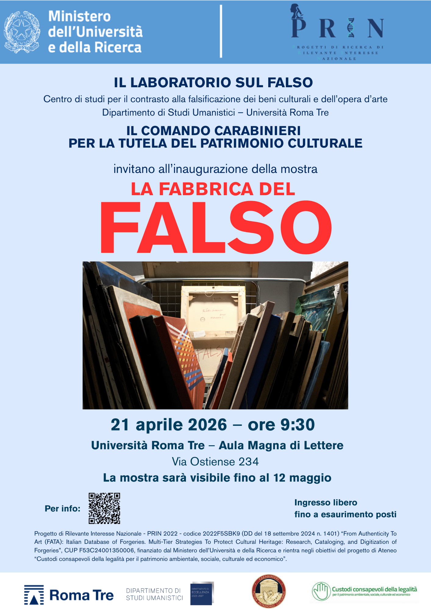 “La fabbrica del falso” è una mostra a ingresso libero organizzata dal Link identifier #identifier__126472-1Laboratorio sul Falso – Centro di studi per il contrasto alla falsificazione dei beni culturali e dell’opera d’arte del Dipartimento di Studi Umanistici, in collaborazione con il Link identifier #identifier__44809-2Comando Carabinieri Tutela Patrimonio Culturale (Comando TPC) e nell’ambito del progetto Link identifier #identifier__151389-3PRIN “FATA”.